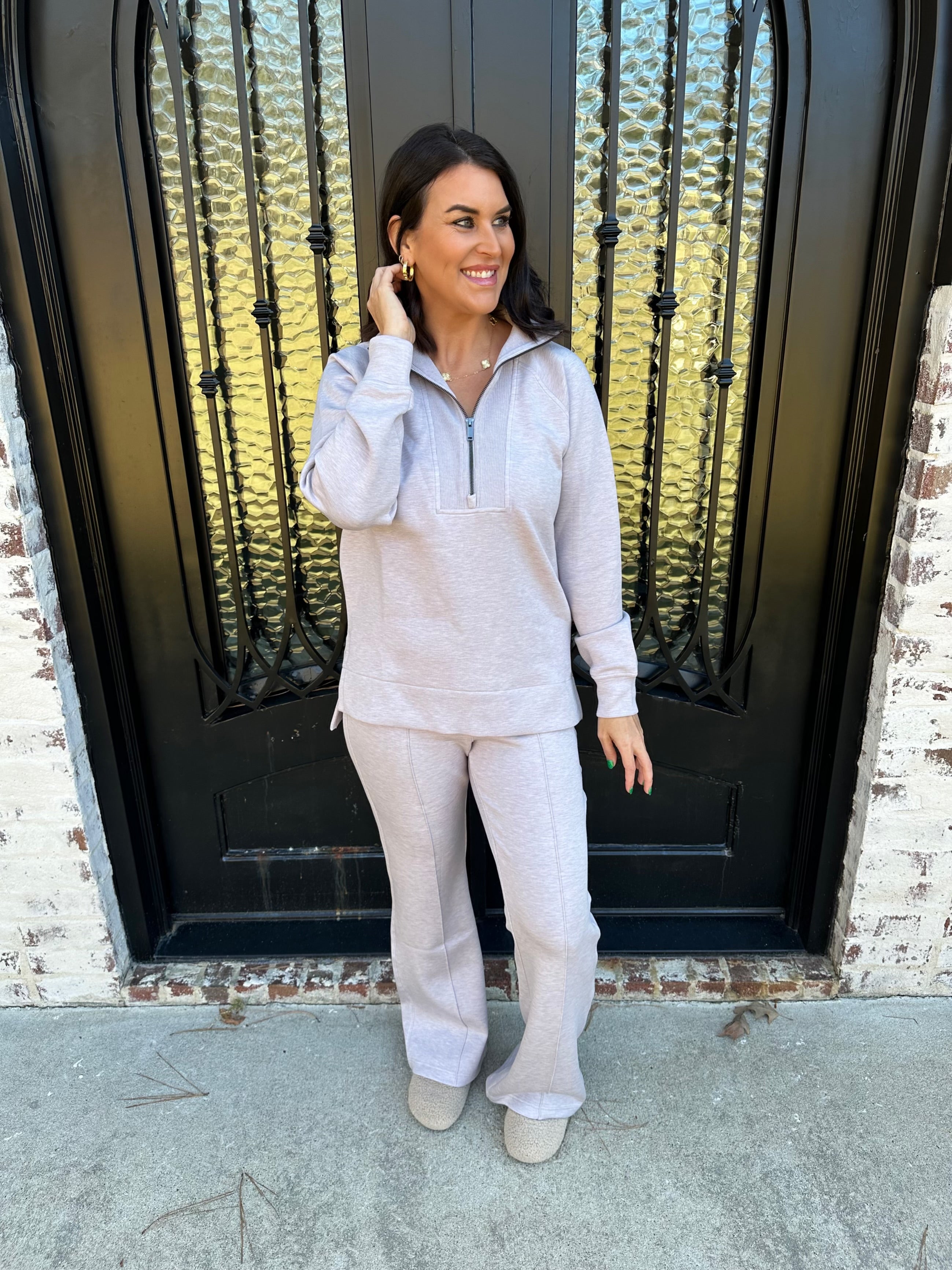 - Relaxed Brushed Flare Pant: High-rise fit with a leg-lengthening flare