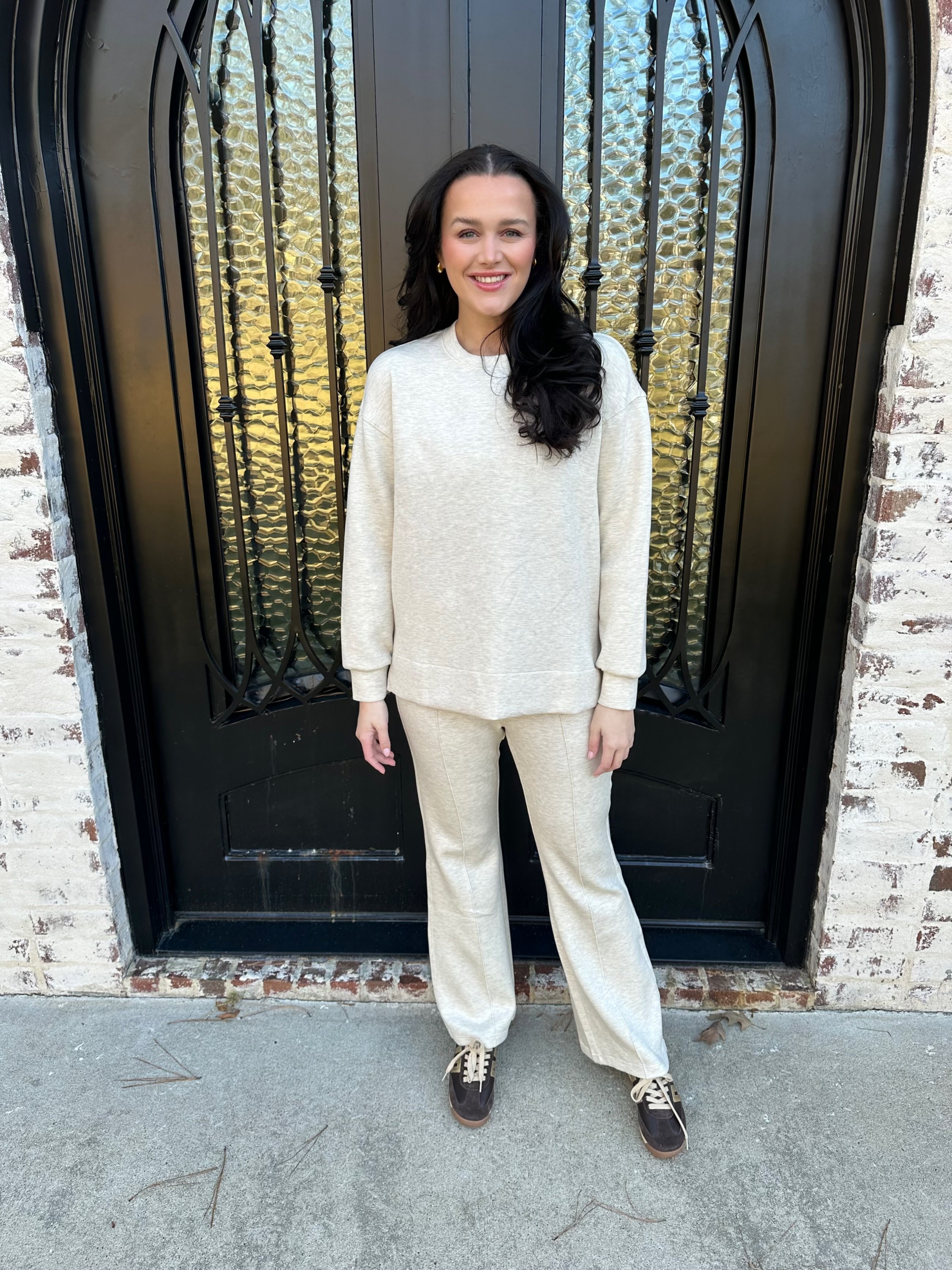 - Relaxed Brushed Flare Pant: High-rise fit with a leg-lengthening flare