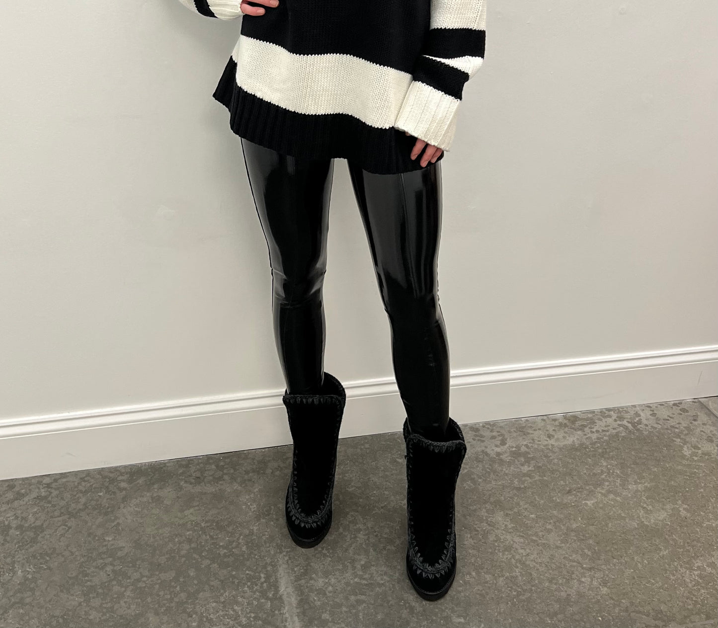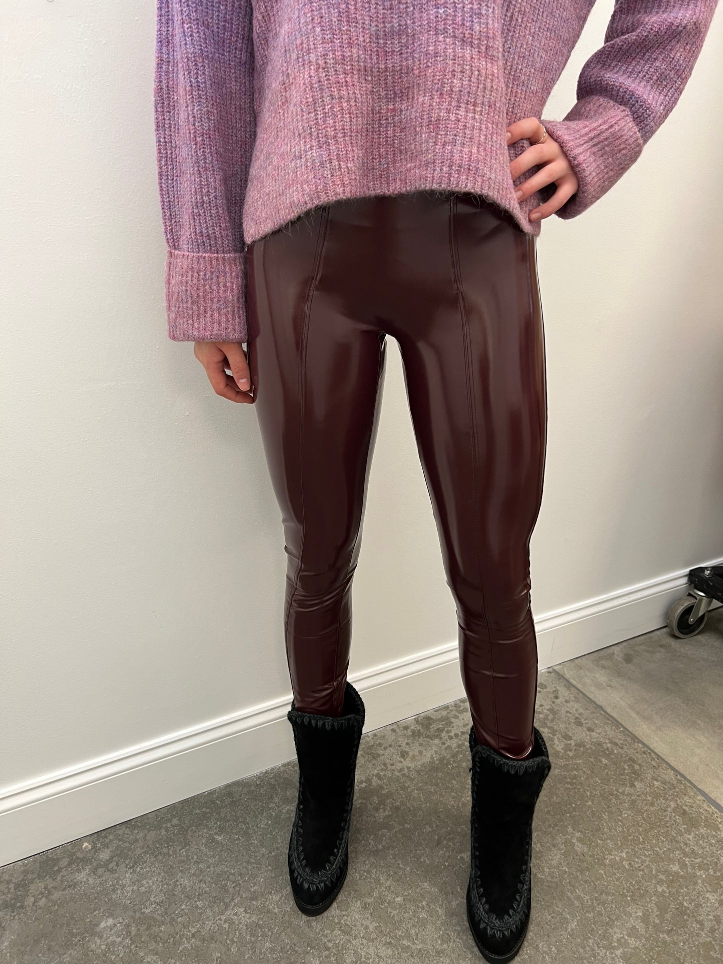 Faux Leather that flatters. This style features high-shine, smoothing faux patent leather fabric and a hidden contoured waistband. This style was designed with a unique finish that gives them their rich color and shine.