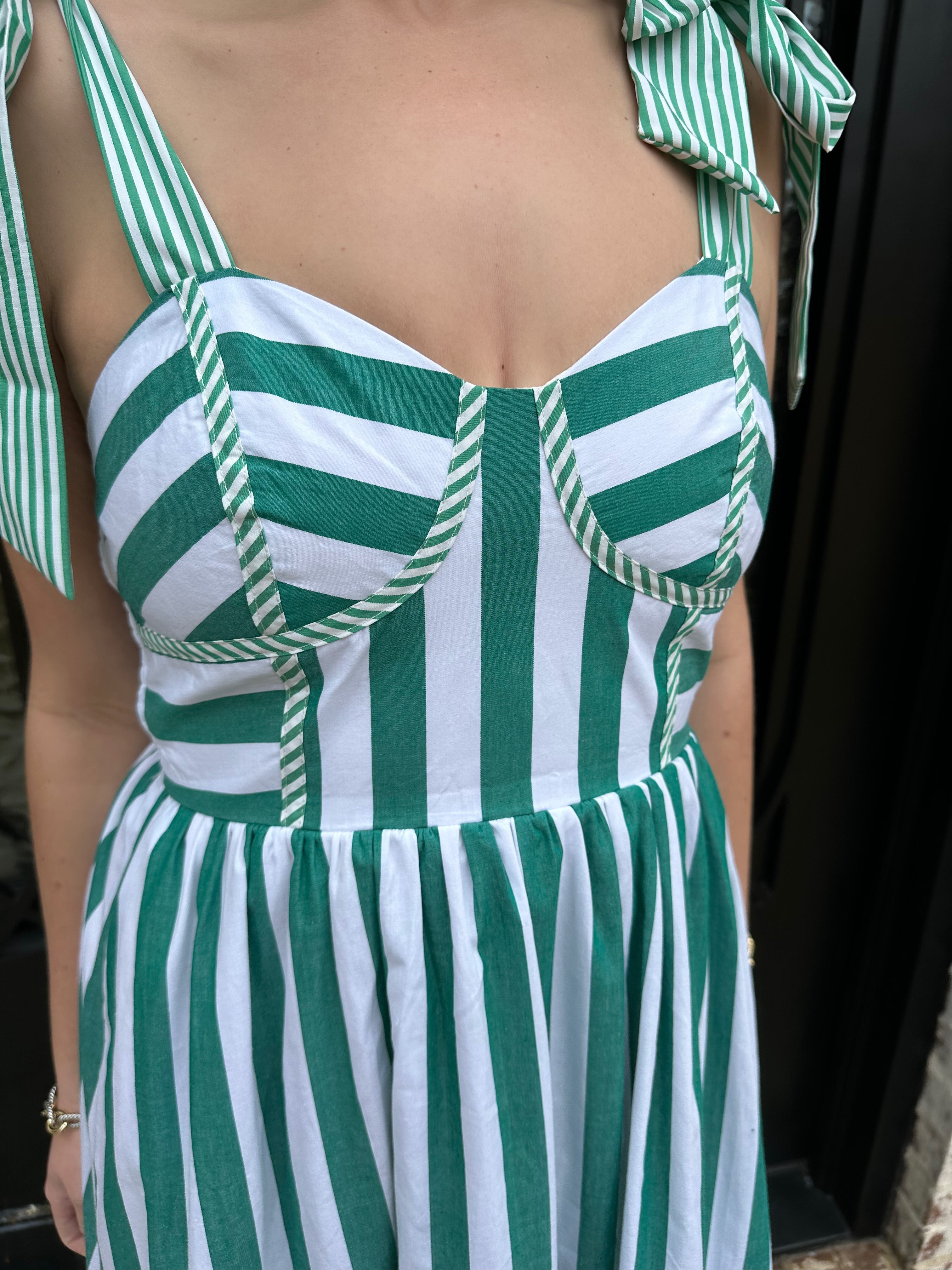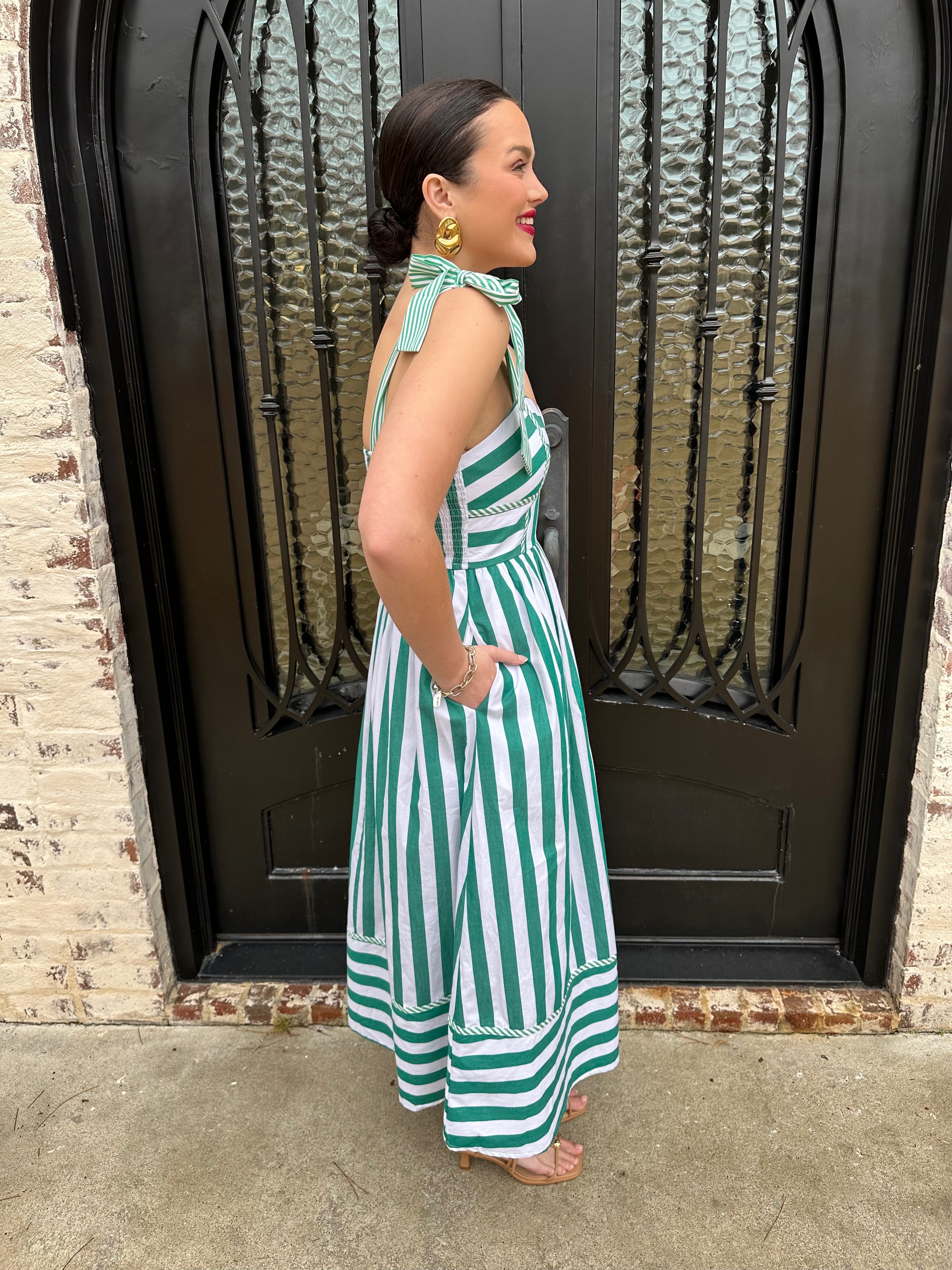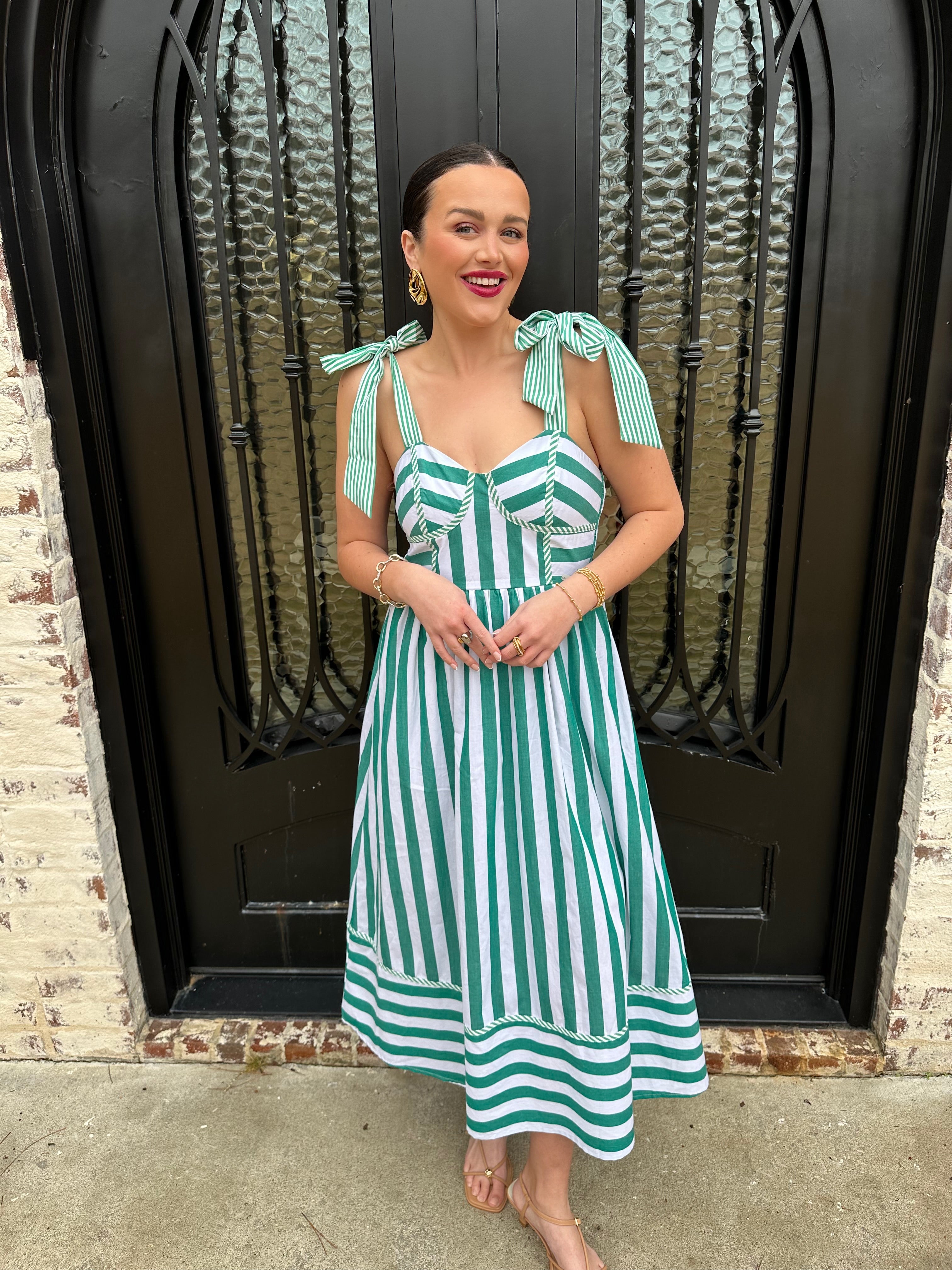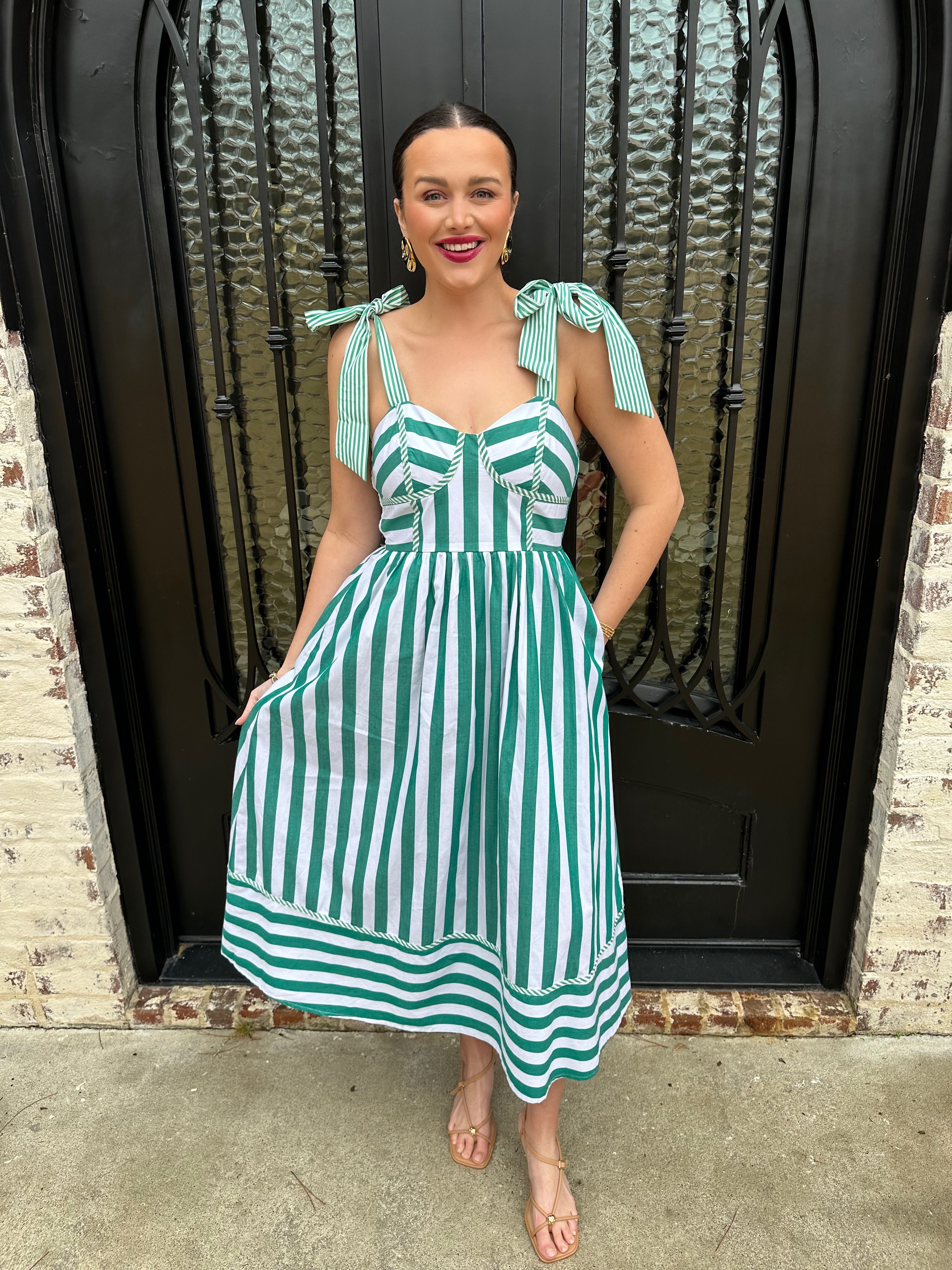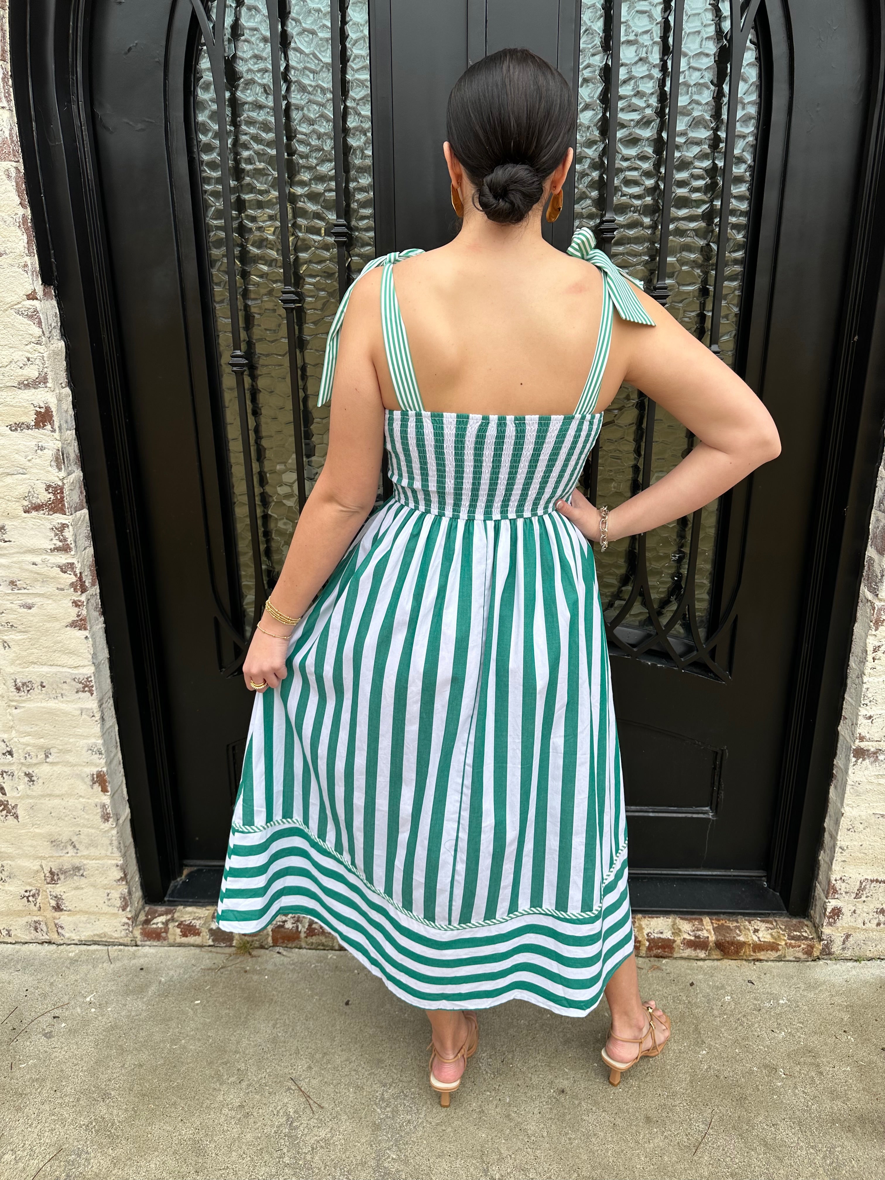 Master preppy elegance with the Striped to Perfection Midi Dress in Green—your go-to piece for spring and summer's most memorable moments. Crisp stripes in a sophisticated green shade create an instantly polished look, whether you're attending an afternoon tea, navigating rush week, or exploring sun-soaked destinations. The flattering cup bodice offers support and structure, while the smocked back ensures comfort and graceful movement. This midi dress proves that timeless style never goes out of fashion—it simply waits for the right occasion.
