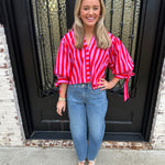 Sunny Days Stripe Button Up Puff Sleeve Top in Pink