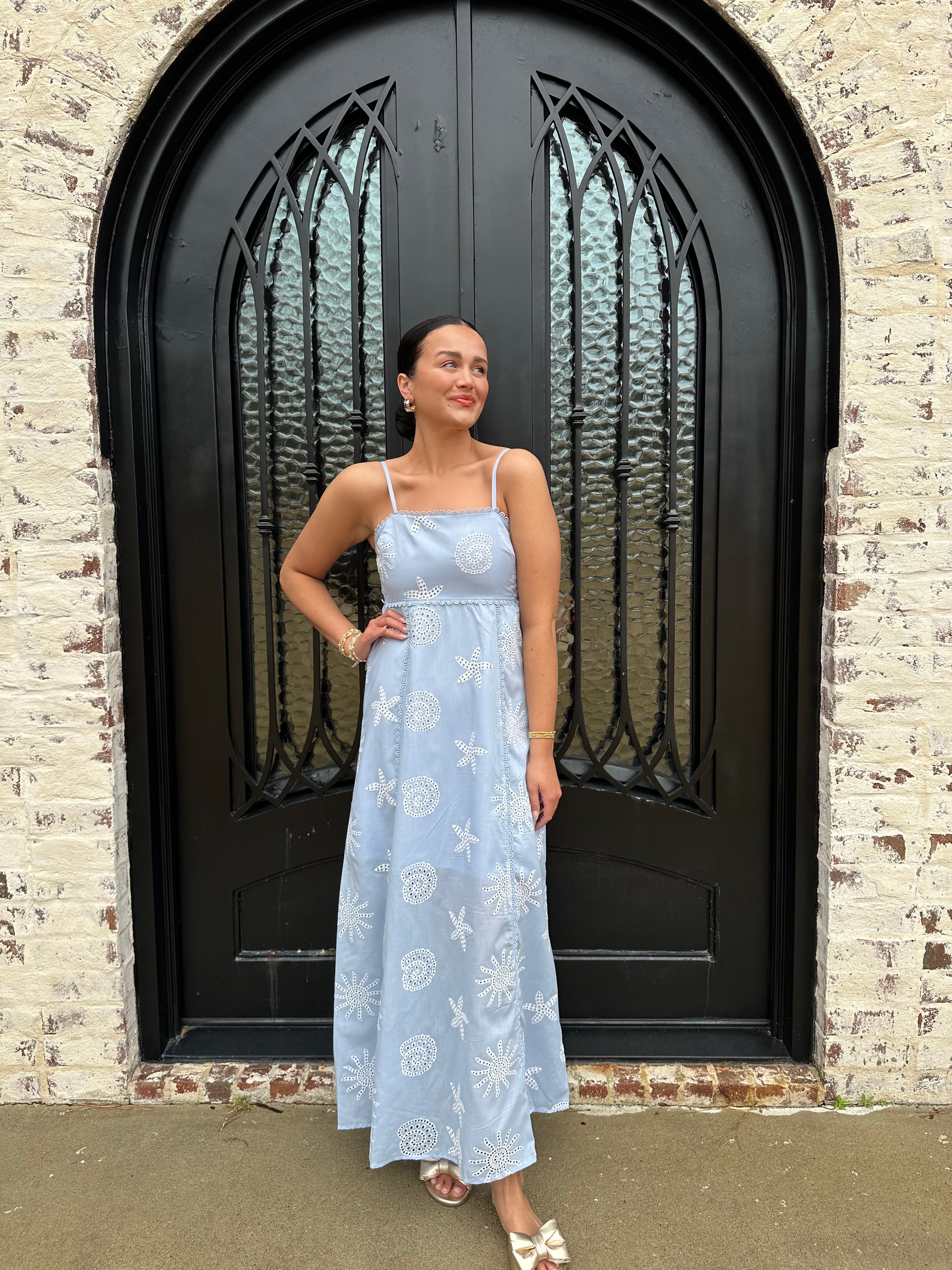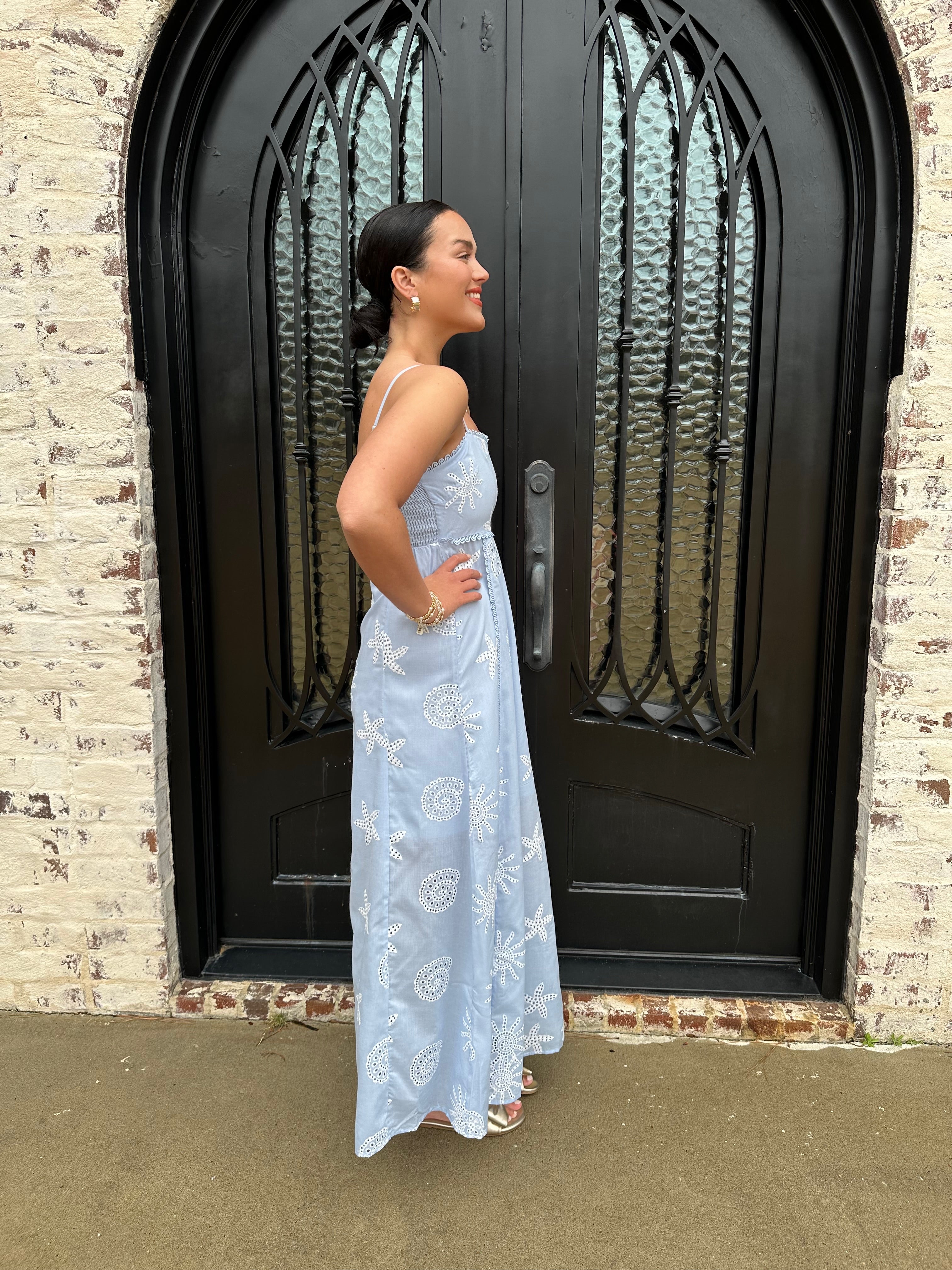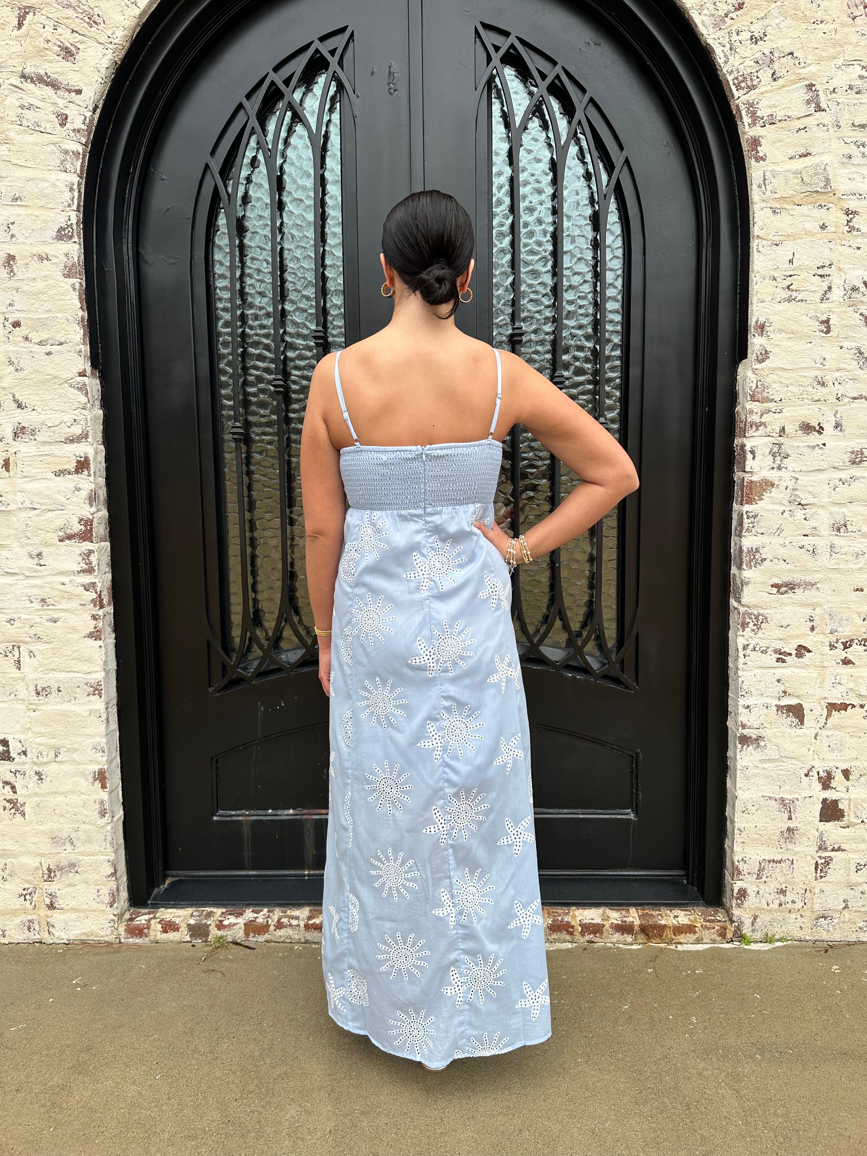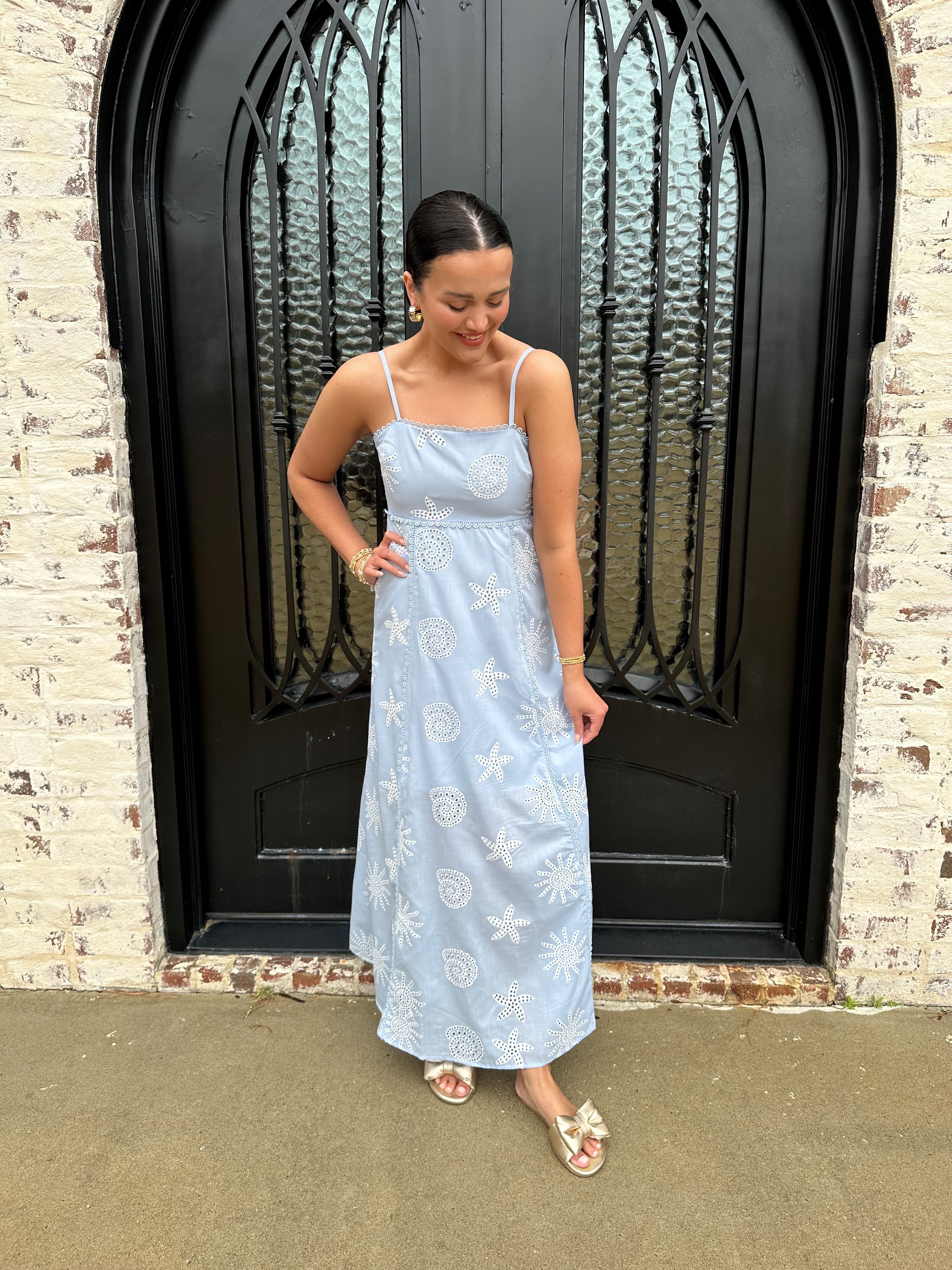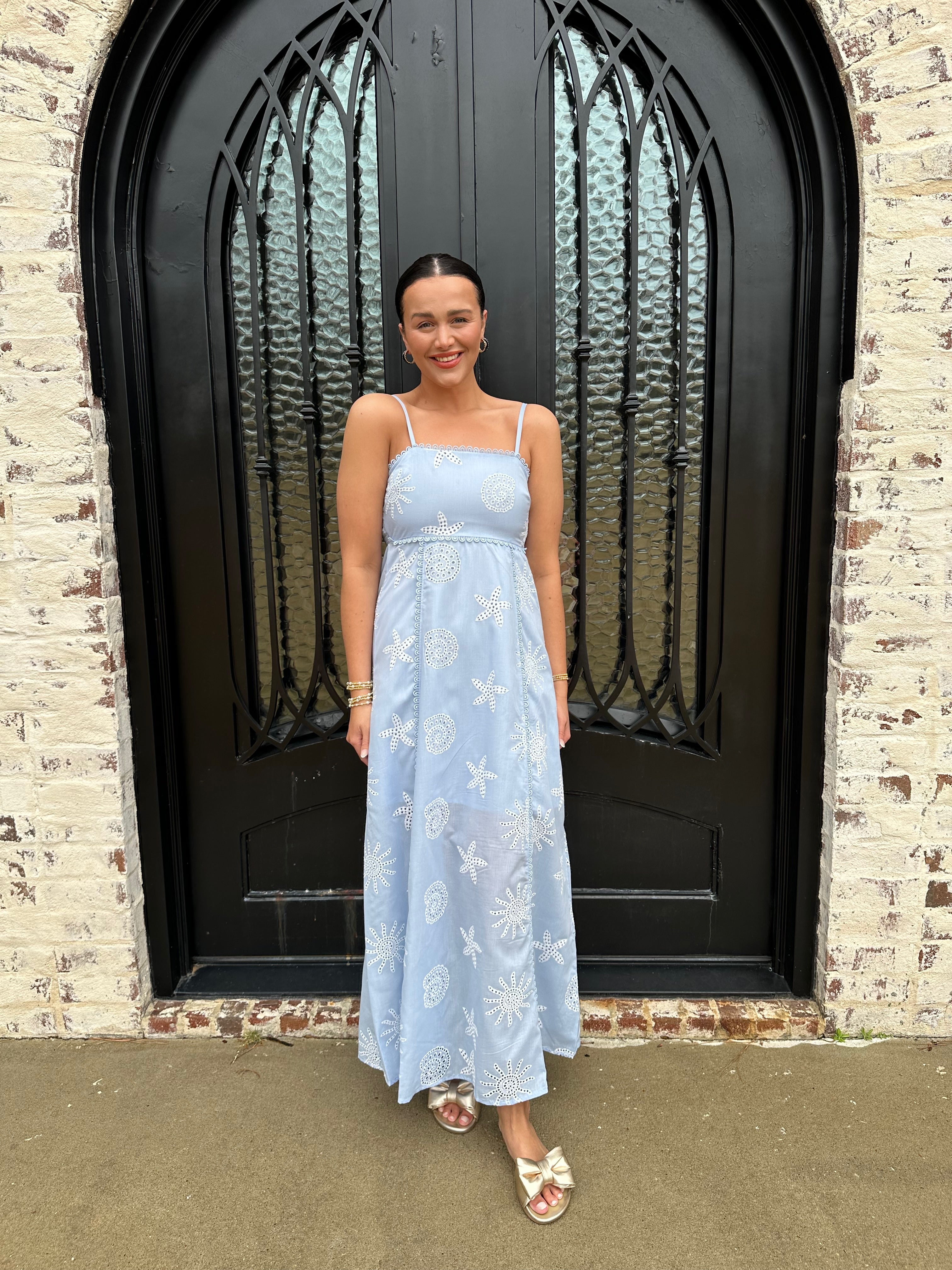 The Tessa Dress is a stunning addition to your spring and summer wardrobe. Featuring a beautiful starfish embroidered pattern in a vibrant blue, its smocked back and hidden zipper ensure a perfect fit. Ideal for spring break or beach getaways, this dress will make you feel confident and stylish all season long!