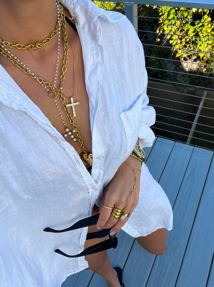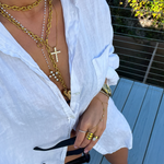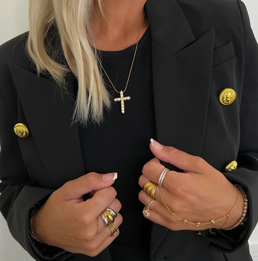 The XL Diamond Cross Necklace in Gold and White is a striking accessory that blends timeless symbolism with dazzling elegance. Featuring a bold cross design encrusted with shimmering diamonds, this necklace adds a powerful statement to any outfit. Its gold and white contrast enhances its luxurious appeal, making it perfect for those who want to express faith with style and sophistication. Elevate your jewelry collection with this captivating piece that commands attention and inspires confidence.